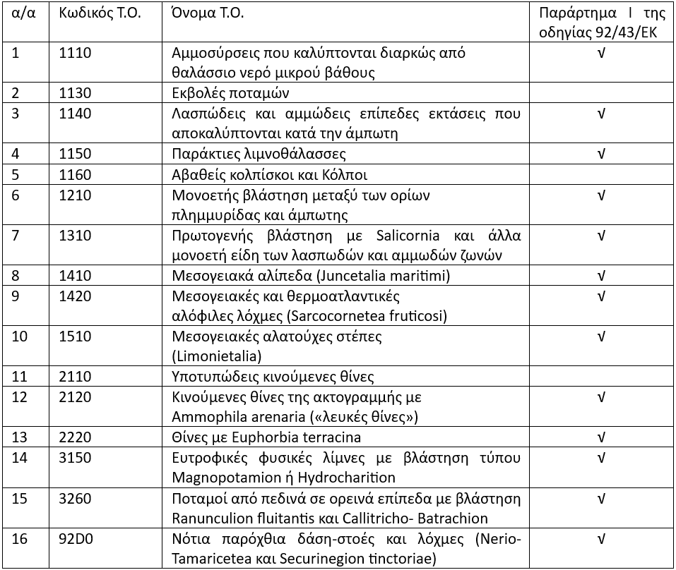 Όπως φαίνεται στον παρακάτω πίνακα, στην περιοχή εμφανίζονται 13 T.O. του Παραρτήματος Ι της Οδηγίας 92/43/ΕΚ, εκ των οποίων οι Τ.Ο. 1150 παράκτιες λιμνοθάλασσες και Τ.Ο. 1510 Μεσογειακές αλατούχες στέπες, είναι οικότοποι προτεραιότητας.